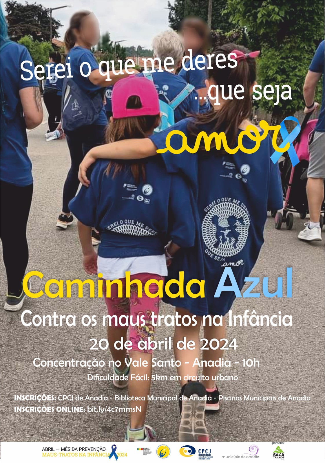 A “Caminhada Azul” vai ter lugar, no dia 20 de abril, em parceria com o Saca Trilhos Anadia. A concentração será frente às instalações da CPCJ de Anadia, no Vale Santo. A receção dos participantes tem início às 9h00, com a caminhada, numa extensão de cerca de 5 kms, a iniciar-se pelas 10h00. Um percurso completamente urbano, pela cidade de Anadia, com um grau de dificuldade fácil. As inscrições, gratuitas e obrigatórias, podem ser realizadas, presencialmente na Biblioteca Municipal, Complexo das Piscinas Municipais e na CPCJ, assim como online, através do seguinte link: https://bit.ly/4c7mmsN.