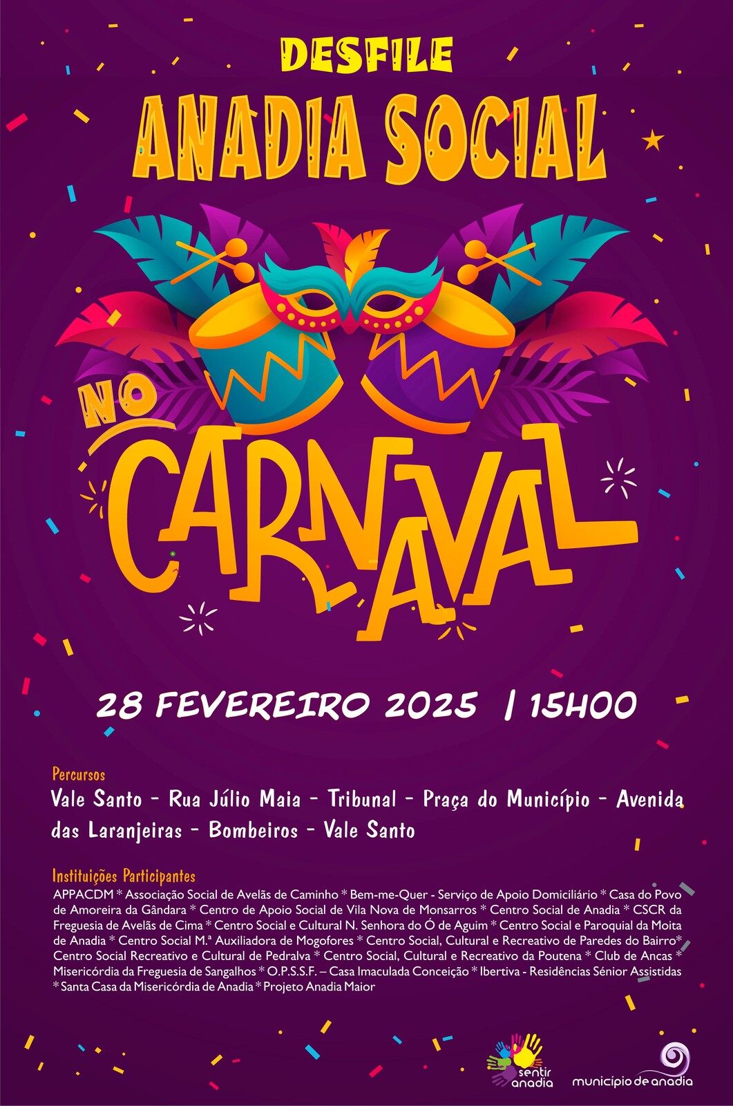 O Município de Anadia, através da Rede Social, irá promover o tradicional cortejo de Carnaval, intitulado “Anadia Social no Carnaval!”, no próximo dia 28 de fevereiro, 6ª feira, pelas 15h00, no centro da cidade de Anadia.