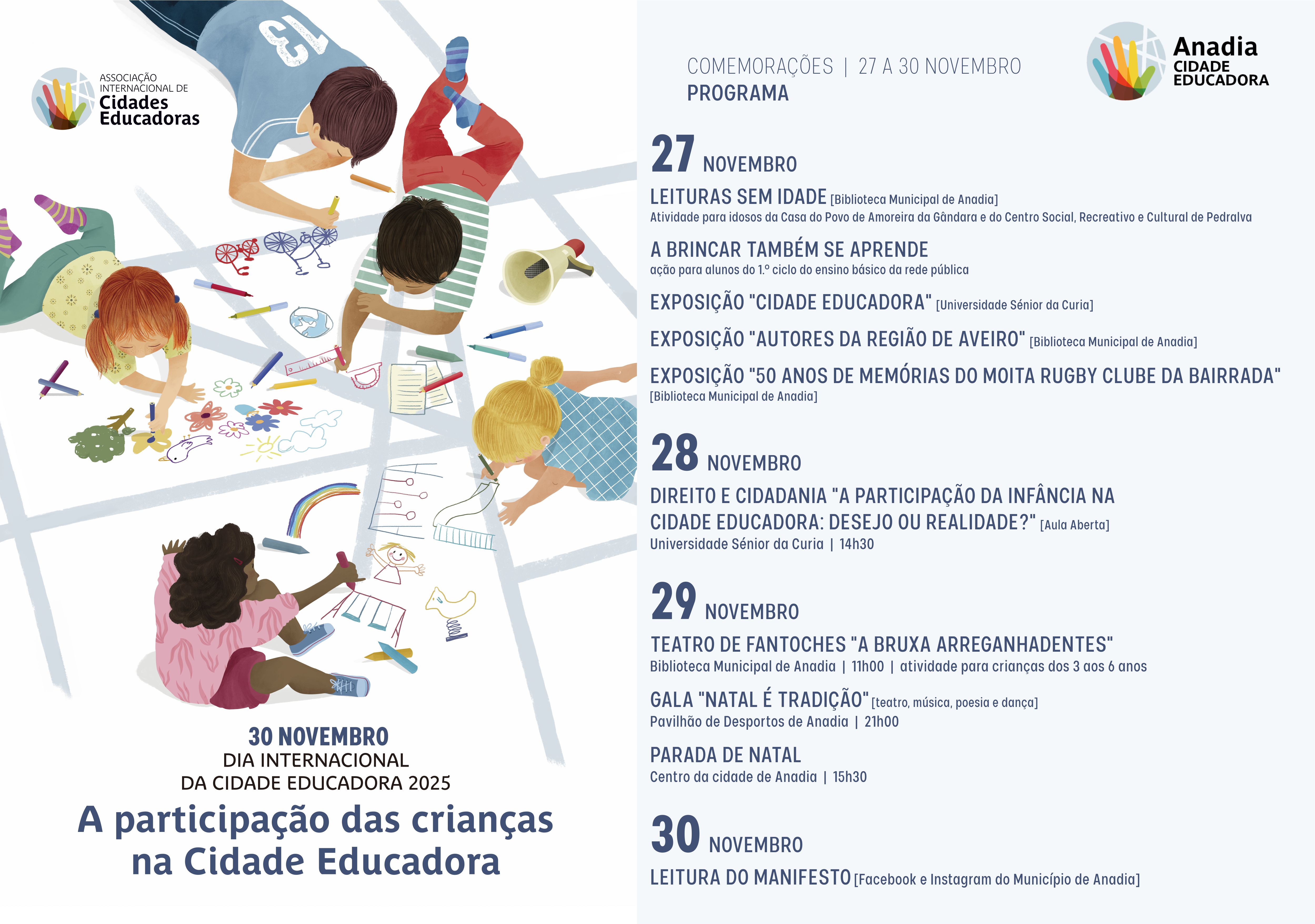 área de conteúdos (não partilhada)O Dia Internacional da Cidade Educadora comemora-se a 30 de novembro (domingo). Esta celebração internacional alerta para a importância da educação e dá visibilidade ao compromisso dos governos locais para que continuem a apostar na educação como vetor de bem-estar, convivência, prosperidade e coesão social. Anadia é Cidade Educadora desde 2016, ano em que passou a integrar a Associação Internacional das Cidades Educadoras, uma rede que reúne cerca de 500 administrações locais comprometidas com a educação.