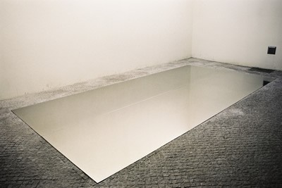 Um plano horizontal constrói o chão. Esta superfície de aço, extremamente polido, abre um vazio no chão. Colocamo-nos perante um duplo vazio onde o chão é a imagem do céu.