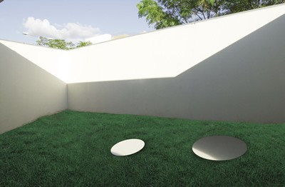 É da ordem do desejo o contacto do corpo com a superfície relvada, onde se encontram dois círculos de aço polido que são espelhos para pessoas e paisagem (céu, árvores, luz).