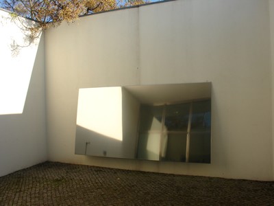 Ao longo do muro, uma faixa de aço polido, repensa os limites do pátio, criando a ilusão de um outro espaço, de uma fractura que se abre no muro, ao nível do chão, através da qual a luz se escoa.