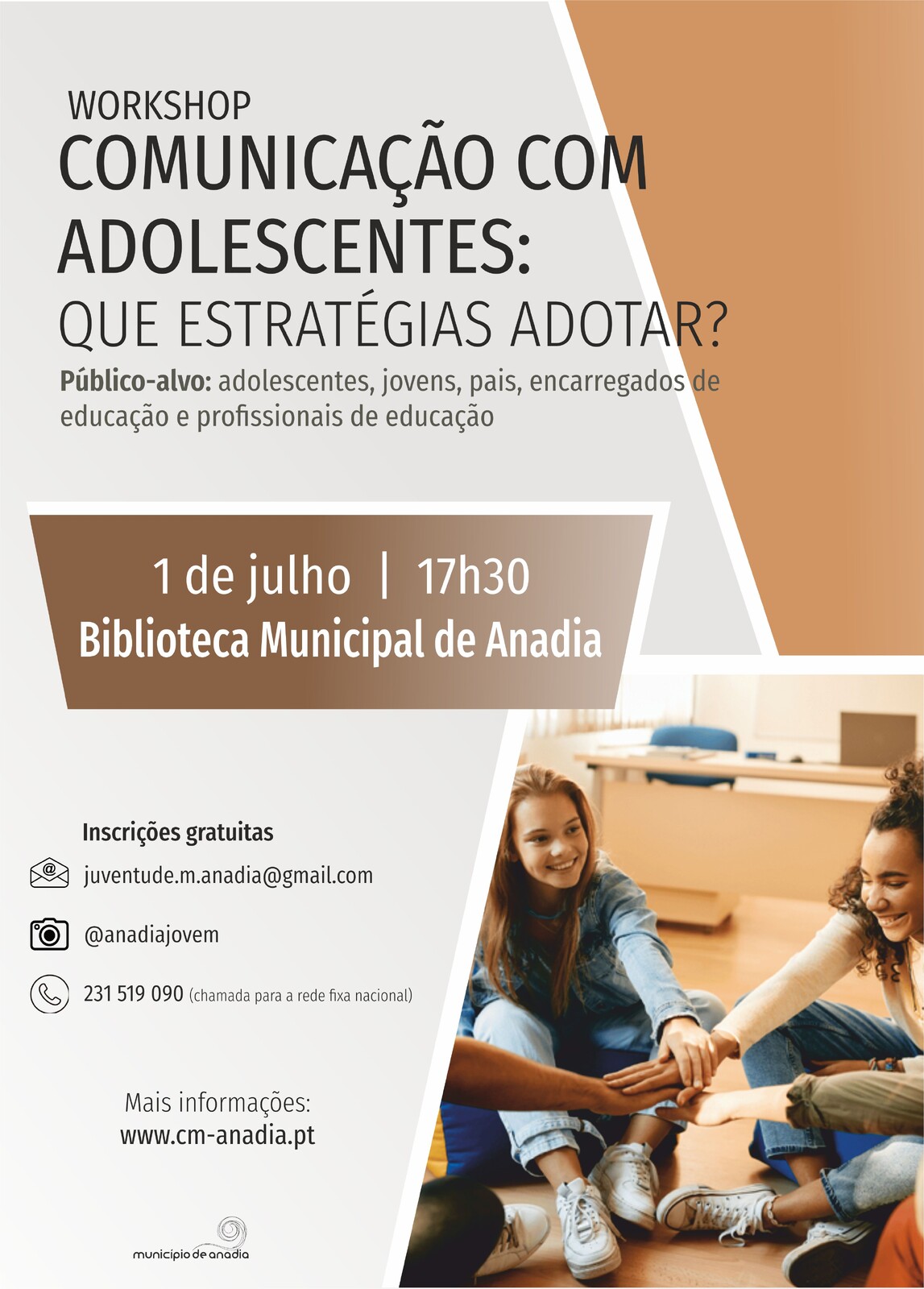 O Município de Anadia promove no próximo dia 1 de julho, entre as 17h30 e as 19h00, na Biblioteca Municipal o workshop “Comunicação com adolescentes: que estratégias adotar?”. Uma iniciativa direcionada a adolescentes, jovens, pais, encarregados de educação e profissionais da área da educação.