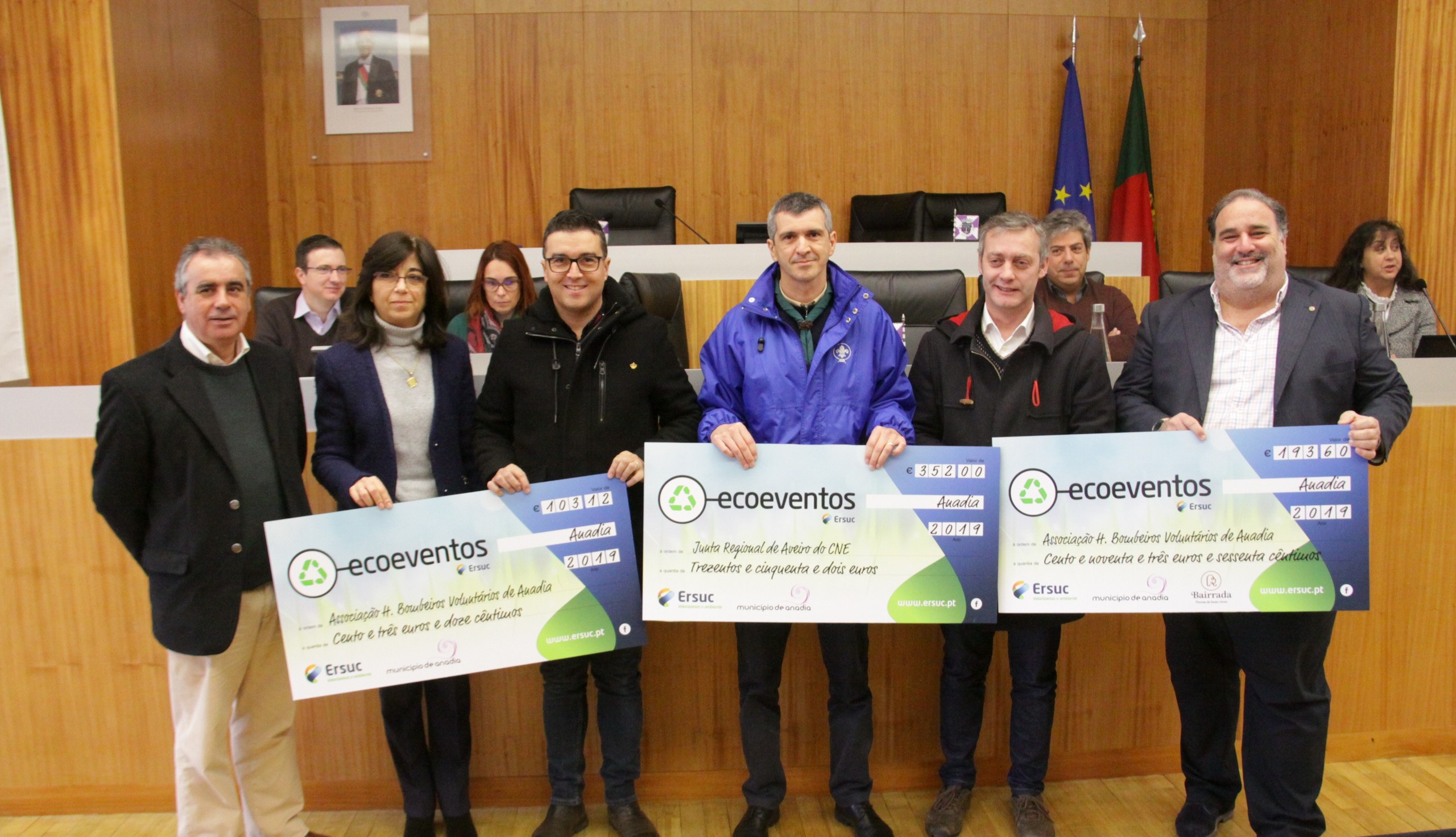 O Município de Anadia, Rota da Bairrada, Comissão Vitivinícola da Bairrada e ERSUC – Resíduos Sólidos do Centro SA entregaram à Associação Humanitária dos Bombeiros Voluntários de Anadia (AHBVA) e à Junta Regional de Aveiro do Corpo Nacional de Escutas (CNE), no passado dia 22 de janeiro, nos Paços do Município de Anadia, apoios monetários que traduzem a quantidade de resíduos recolhidos em eventos, realizados no concelho de Anadia em 2019, que ostentaram o selo “Ecoevento”.
