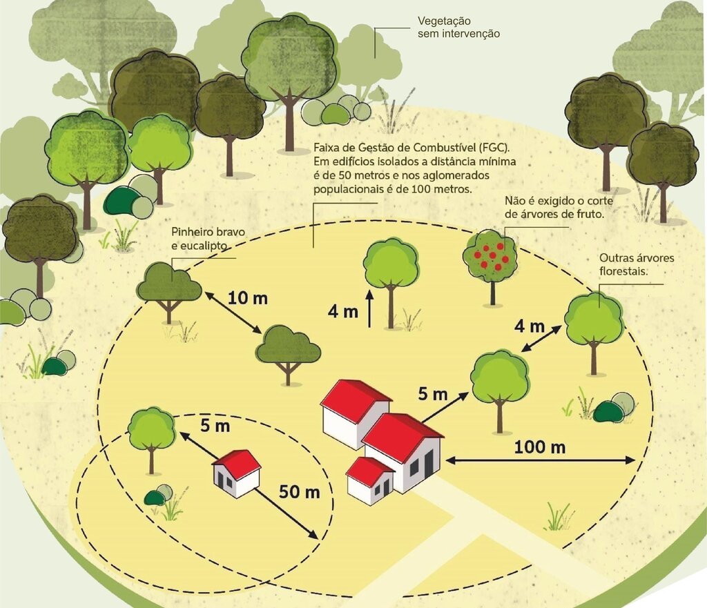 Segundo o Plano Municipal de Defesa da Floresta Contra Incêndios, a limpeza deve ser feita numa faixa de largura não inferior a 50 metros, no caso de edifícios, e de largura não inferior a 100 metros, em torno dos aglomerados populacionais. A gestão de combustíveis a executar nestas áreas deve ter em conta os seguintes critérios: no estrato arbóreo, a distância entre as copas das árvores deve ser, no mínimo, de 10 metros, nos povoamentos de pinheiro bravo e eucalipto, e de 4 metros para as outras espécies. A desramação deve ser de 50% de altura da árvore até que esta atinja os 8 metros, altura a partir da qual a desramação deve alcançar, no mínimo, 4 metros acima do solo. No estrato arbustivo, a altura máxima da vegetação não pode exceder os 50 centímetros e, no estrato subarbustivo, a altura máxima da vegetação não pode ser superior aos 20 centímetros. As copas das árvores e dos arbustos devem estar distanciadas, no mínimo, 5 metros da edificação, evitando-se ainda a sua projeção sobre a cobertura do edifício. Não poderão ocorrer, nos terrenos, quaisquer acumulações de substâncias combustíveis, como lenha, madeira ou sobrantes de exploração florestal ou agrícola, bem como de outras substâncias altamente inflamáveis.